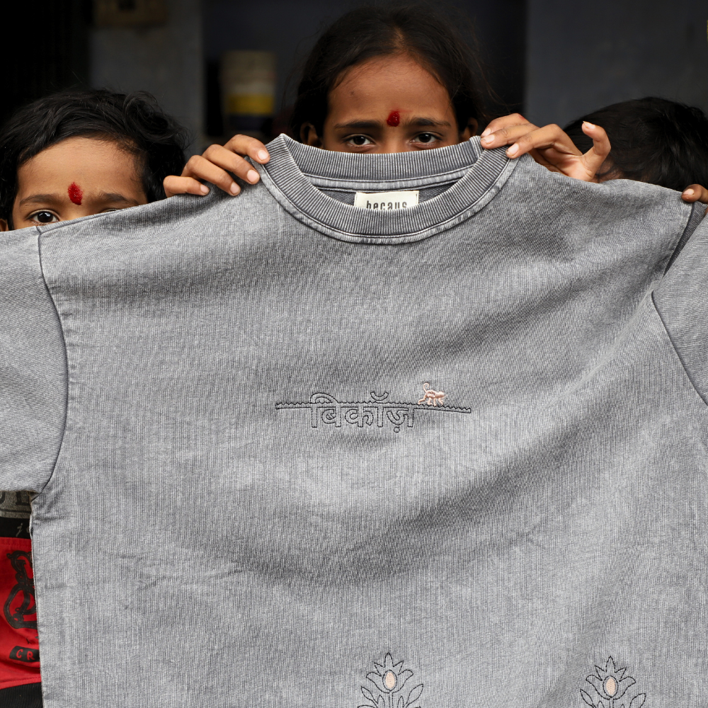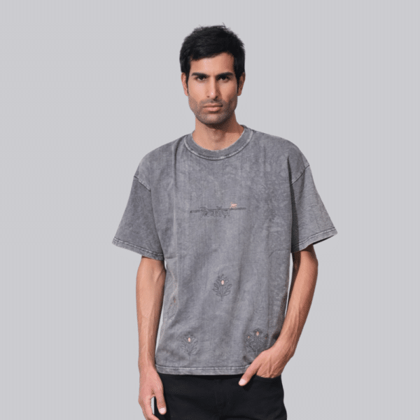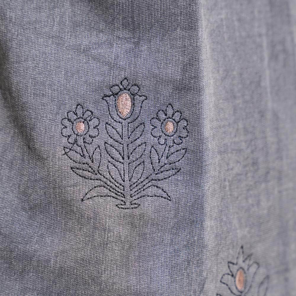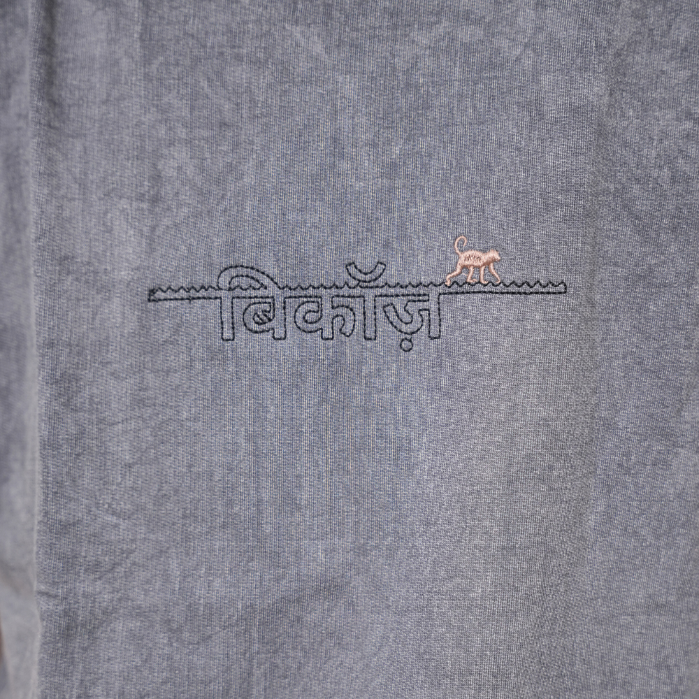 Meet the Bandar T-shirt — a playful ode to Jaipur’s mischievous monkeys. Crafted in soft 100% cotton with a stone-washed grey finish, it features a cute embroidered monkey surrounded by floral motifs inspired by Rajasthan’s painted walls and doors. Fun, comfortable, and full of character, it’s the perfect everyday T-shirt with a story to tell.