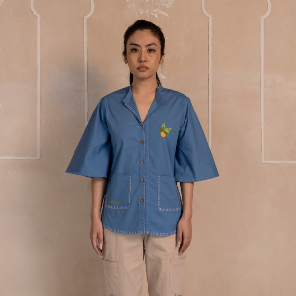A tribute to forgotten fruits and the quiet beauty of everyday moments, this top is a piece of art in itself. Crafted in 100% cotton and dipped in calming hues of blue, it’s inspired by the nostalgic image of a woman gathering ber (jujube) in a basket — a fruit that once defined childhoods but now lives quietly in memory. With delicate blanket stitch detailing, hand-done by artisans, this top blends storytelling and craftsmanship in every thread.
