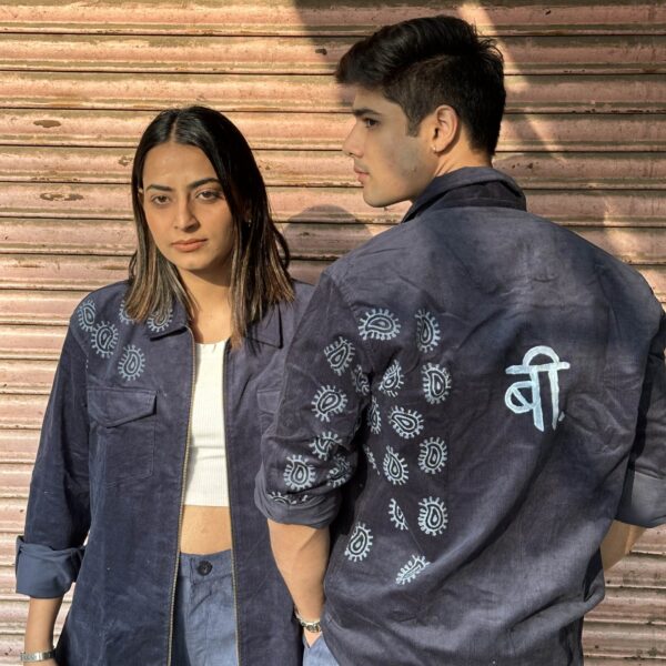 Our classic Navy Blue Corduroy Jacket is all about timeless style with an artful twist. Crafted from 100% cotton corduroy, it features a relaxed silhouette that’s both comfortable and versatile. Intricate block-printed details on the front and back add a touch of tradition, while the hand-painted ‘बी’ on the back makes it a true statement piece. Unisex and effortlessly stylish, it pairs perfectly with our cord pants for a sleek, coordinated set that never goes unnoticed.