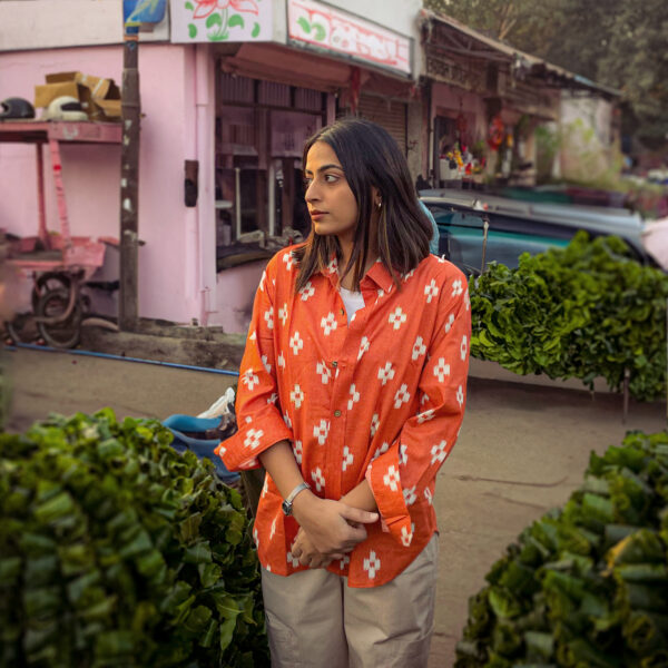 Brighten up any festive or party look with this stunning unisex Ikat shirt in vibrant orange cotton. Featuring golden zari details on the front, this showstopper piece transitions effortlessly beyond the festive season, making it a timeless addition to your wardrobe.