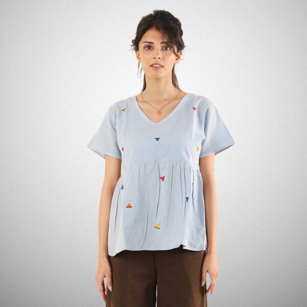 Our Frill Top, made from 100% cotton, is the perfect addition to your collection. Its blue hue ensures versatility, pairing effortlessly with any bottoms. Designed with inspiration from decorative frills and colorful bunting flags, it brings a cheerful and fun vibe. The fun fringes on the back enhance its charm, making it a standout piece. Perfect for casual outings, this top will add a playful touch to your style.