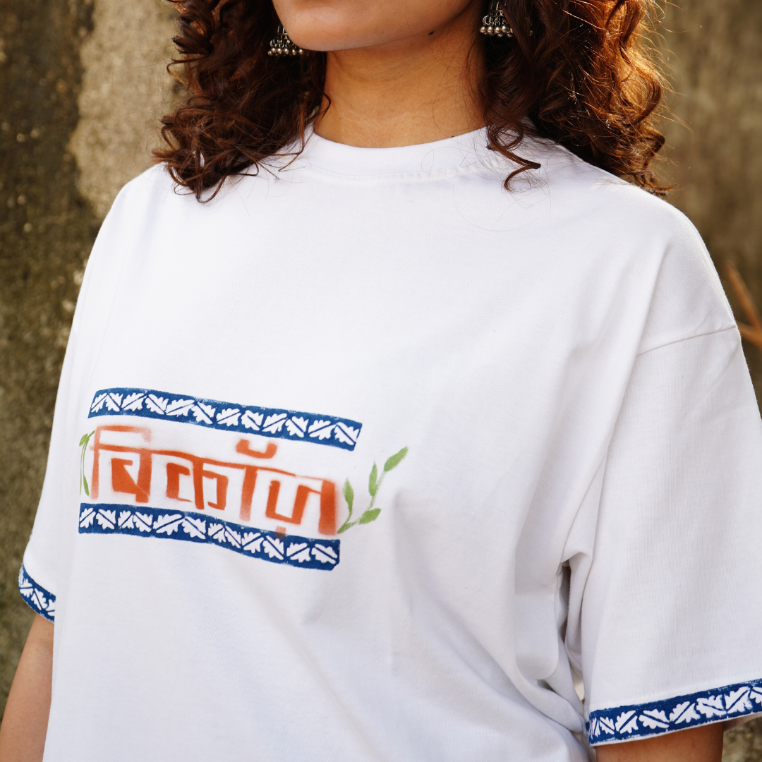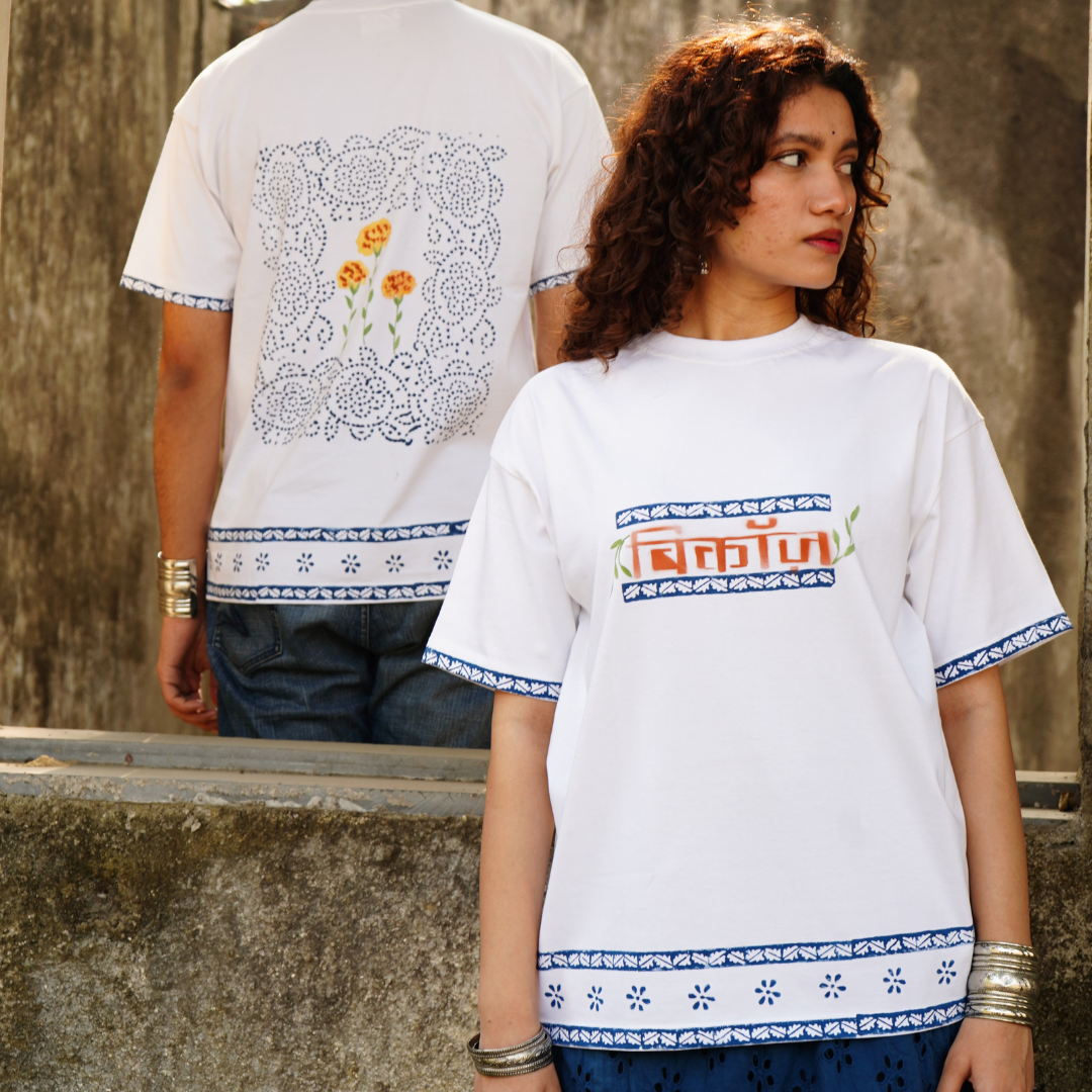 Crafted in soft 100% cotton, the Kaner T-Shirt turns a classic white canvas into a celebration of handcraft, featuring block printing, hand-painted Kaner flowers at the back, and a spray-painted becaus. logo in the front. Each piece carries its own character, finished in a modern oversized silhouette — made slowly and meant to be lived in.
