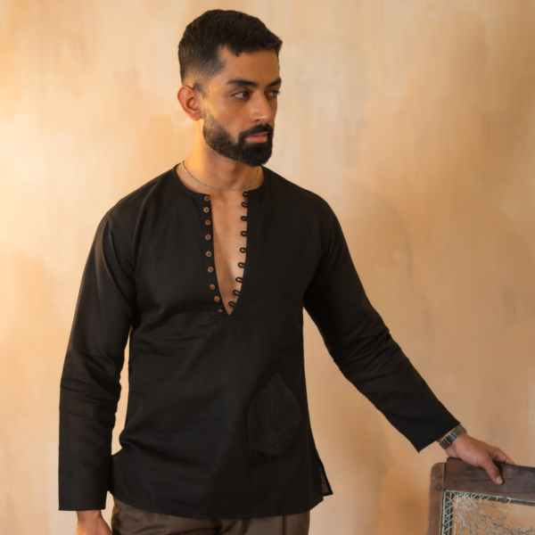 The Mehrab Kurta is a harmonious blend of Indian elegance and Persian aesthetics. The pocket, reminiscent of Persian windows, adds a touch of mystique to the traditional silhouette. Whether you’re dressing up for an event or going for a laid-back outing, this Kurta is your perfect companion. The ‘Becaus’ hand-embroidery on the back makes a bold statement.