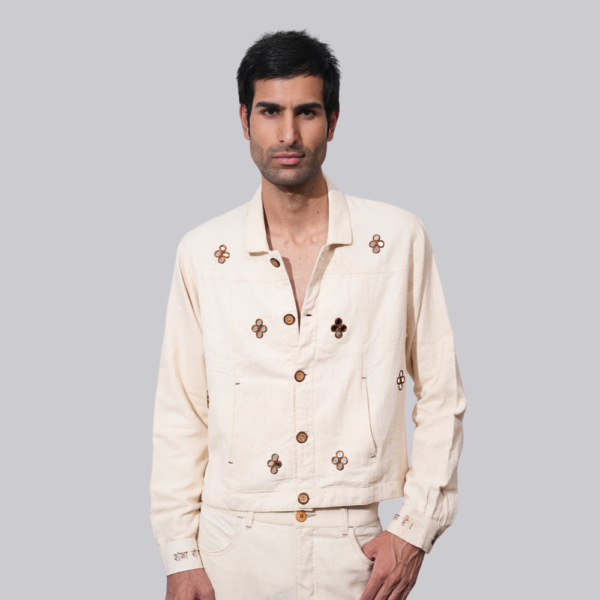A statement piece inspired by the grandeur of Rajasthan’s Sheesh Mahals. Crafted in 100% handwoven khadi with intricate hand-embroidered mirror work, this jacket captures timeless elegance with a hint of nostalgia. Featuring the iconic Bollywood line “Sheesha ho ya dil, toot jata hai” — it’s not just a jacket, it’s an emotion.