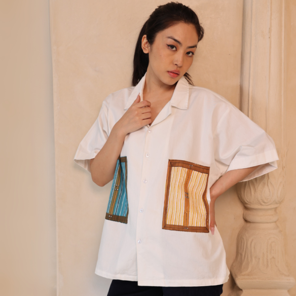 Introducing the re-launched “The Window Shirt” – a crowd favorite making a grand return! This 100% cotton shirt features hand-painted pockets and eye-catching block print patches on the back. Its boxy fit offers ultimate comfort and style for both men and women. Stand out from the crowd with this unique, artfully designed piece.